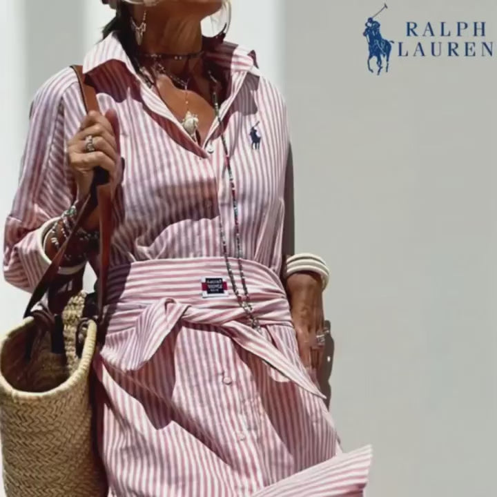 R. Ꮮаᴜгеn Stripete Belte-Midje Skjortekjole – Tidløs Eleganse med Moderne Allsidighet
